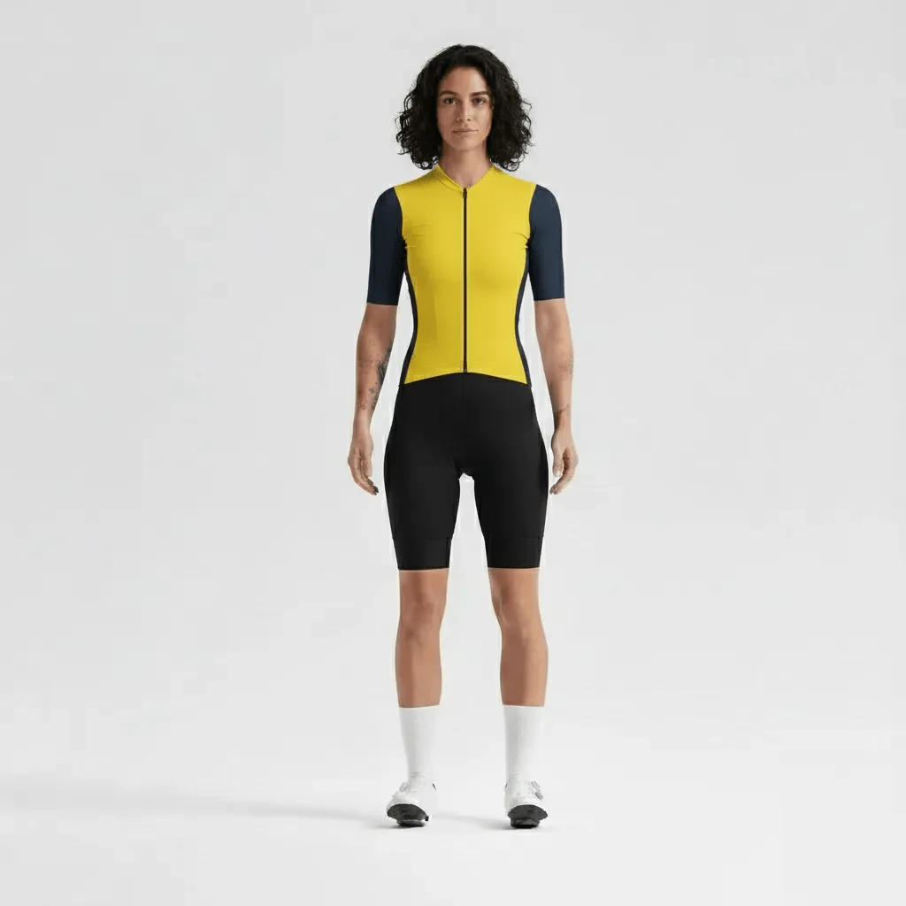 Combo Jersey más bib short de ajuste perfecto sin costuras. Este bib no tiene banda siliconada, creando un ajuste más limpio y cómodo.